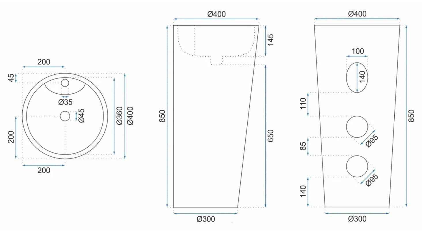 Отдельностоящий керамический умывальник Blanka – это уникальное монолитное изделие в виде постамента. Чрезвычайно современный дизайн идеально впишется в любую стильно оформленную ванную комнату. Большие размеры, классическая круглая форма чаши, отверстие под смеситель и перелив делают ее практичным элементом сантехники вашей ванной комнаты.