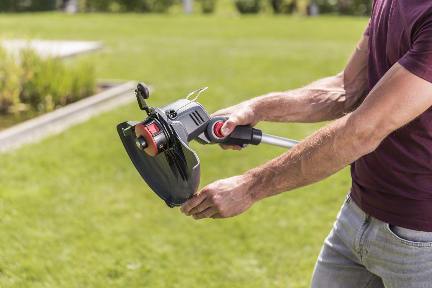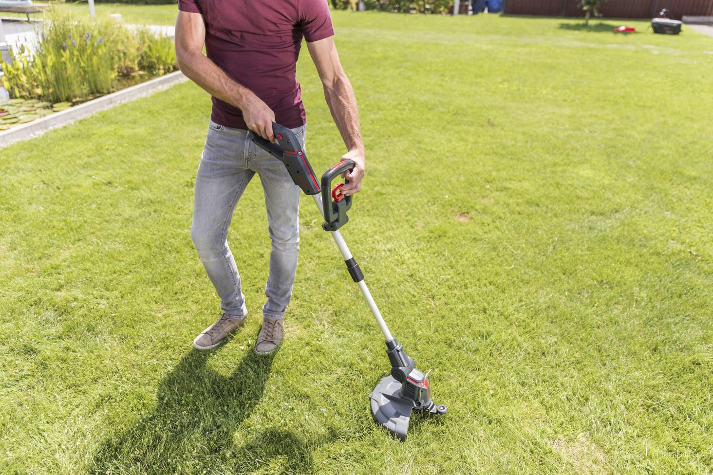 Вага лише 2,4 кг разом з акумулятором і ергономічною регульованою додатковою ручкою, тример є надзвичайно мобільним і простим у використанні помічником для будь-якого власника саду. Рухома тримерна головка, що нахиляється, із шириною зрізу 25 см і планка для захисту рослин забезпечують точне підстригання країв газону, під кущами та біля стін. Завдяки функції автоматичного імпульсу ви можете легко встановити оптимальну довжину волосіні при обрізанні. Алюмінієву телескопічну палицю з регульованою висотою можна індивідуально налаштувати відповідно до потрібного зросту користувача.