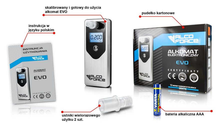 AlcoForce EVO — легкий, елегантний алкотестер, оснащений сучасним електрохімічним датчиком 4-го покоління. Пристрій AlcoForce виділяється не тільки своїм цікавим зовнішнім виглядом, але і винятковою простотою використання. Корпус алкотестера надзвичайно стійкий до подряпин завдяки своїй цікавій, трохи грубій текстурі.