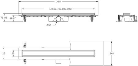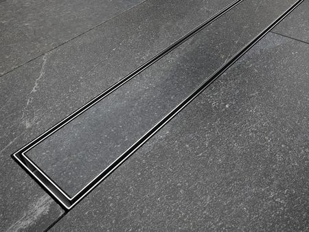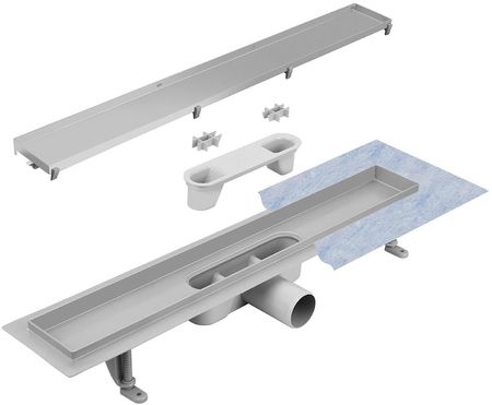 жолоб тонкий, ширина 6,5 см, дренаж із пластику, монтажна висота (57 мм від фланця), підключення Ø 50 мм, пропускна здатність сифона до 56 л/хв, сифон, очищається зверху, 2 в 1 решітка, хромована обробка, або для монтажу з керамічною плиткою, комплект включає: жолоб з сифоном і ніжками в зборі, решітку та ущільнювальний мат. Встановлюється швидко та легко очищенняРешітка двостороння - одна сторона для приклеювання плитки, інша сторона декоративна шліфована сталь