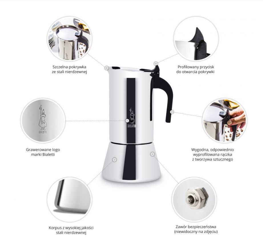 Кавоварка дуже щільна та має зручну ручку, щоб ви могли надійно тримати її з гарячою кавою. Сучасна кавоварка Bialetti Venus з нержавіючої сталі - це дуже міцний прилад, який не вбирає присмаків і запахів, і при цьому не змінює смак приготовленої кави.