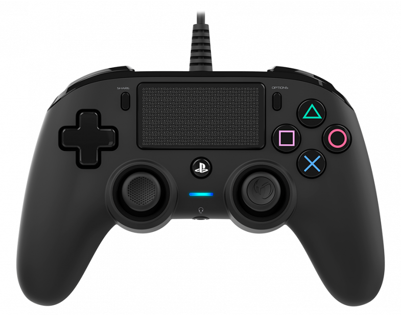 Дротовий компактний контролер NACON має офіційну ліцензію для консолей PS4™ і пропонує низку основних функцій, включаючи сенсорну панель, вібраційні двигуни та світлодіодний індикатор стану програвача. Також містить кнопки дій із символами й кольорами PlayStation®, а також кнопки SHARE, OPTIONS і PS.