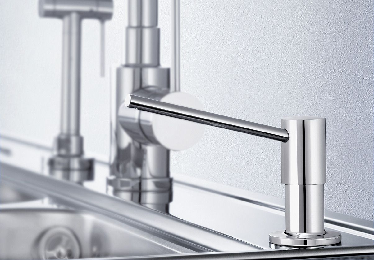Зручне наповнення рідини зверху. Практичний додаток до раковини. Унікально підходить для раковин із нержавіючої сталі. Можна використовувати як дозатор мила чи рідини для миття посуду