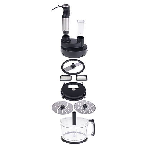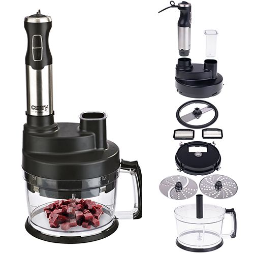 Вирішуючи придбати нове кухонне обладнання, ми зазвичай не хочемо, щоб воно займало багато місця. Наш продукт замінює як мінімум кілька пристроїв! Висока потужність до 1600 Вт дозволяє швидко приготувати, збити або змішати необхідні для тієї чи іншої страви інгредієнти. У набір входить віночок для збивання білків, кремів для тортів і збитих вершків; насадка-пюре для приготування овочевих пюре; дробарка для подрібнення горіхів і сухофруктів; насадка для нарізки: 8x8 мм і 11x11 мм; диск для нарізки на скибочки або товсту стружку; диск для натирання картоплі на млинці. Завдяки таким аксесуарам ви зможете швидко приготувати вечерю, використовуючи лише один прилад! Більше немає раковини, повної каструль, ситечок і терток! Крім того, блендер можна використовувати як ручний, що дозволяє швидко перемішати овочевий суп, приготувати майонез або соус.