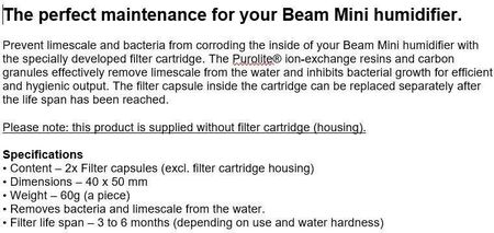 Загальний опис: колір - білий Особливості упаковки / Загальна глибина (мм): 160 ммОсобливості упаковки / Загальна висота (мм): 90,00 ммОсобливості упаковки / Загальна ширина (мм): 85 ммОсобливості упаковки / Кількість упаковки: 1,00 шт. Характеристики упаковки / Папір/картон: 56 гОсобливості упаковки / Вага тари (кг): 0,06 кг Характеристики упаковки / Об'єм (м3): 0,001224 м³Характеристики упаковки / Вбудована батарея: Немає Характеристики упаковки / Податок WEEE: Немає Характеристики упаковки / Пластик (без ПЕТ): 4 г Характеристики упаковки / Кількість піддонів: 706 шт. : Видаляє бактерії та вапняний наліт з води. Термін служби фільтра – від 3 до 6 місяців (залежно від використання та жорсткості води) Технічні деталі / Виробник: DuuxPraca / Сумісність: Для сімейства продуктів Beam miniProducer: Фільтрувальні капсули проти накипу та бактерій (2x) Вага та розміри / Вага виробу: 60x2 gІнше властивості / Розміри виробу (ШxГxВ): 40x40x50 мм Інші властивості / Регульовані функції: запобігайте роз’їданню накипом і бактеріями внутрішньої частини вашого зволожувача Beam Mini за допомогою спеціально розробленого картриджа фільтра. Іонообмінні смоли Purolite® і вугільні гранули ефективно видаляють вапняний наліт з води та пригнічують ріст бактерій для ефективного та гігієнічного виробництва. Капсулу фільтра всередині картриджа можна замінити окремо після закінчення терміну служби. Загальний опис / колір: білий