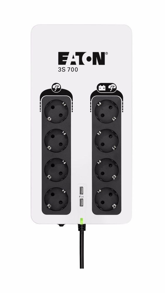 ДБЖ Eaton 3S700D призначений для домашніх користувачів і користувачів малого бізнесу. Елегантний зовнішній вигляд ідеально впишеться в сучасний простір квартир, будинків і офісів. Він забезпечує безперервну роботу пристроїв під час відключення електроенергії та вдосконалений захист від стрибків напруги, який запобігає пошкодженням через удари блискавки або випадкові стрибки напруги. Він дуже тихий. Він забезпечує повну потужність 700 ВА, що перетворюється на 420 Вт активної потужності. Це забезпечує безпеку таких пристроїв, як телевізор, цифровий декодер, настільний комп’ютер, монітор, маршрутизатор, модем, касовий апарат та інші мережеві пристрої.