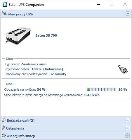 Eaton 3S700D має вісім вихідних розеток DIN (SCHUKO), що є стандартом, який використовується в Польщі. Три розетки забезпечують резервне живлення від акумулятора із захистом від перенапруги. Тут ми можемо підключати ключові пристрої, такі як телевізор, комп’ютер тощо. Решта три роз’єми забезпечують захист від перенапруги, куди ми можемо підключати периферійні пристрої, такі як принтер. ДБЖ має стаціонарний кабель живлення довжиною 1,5 м.