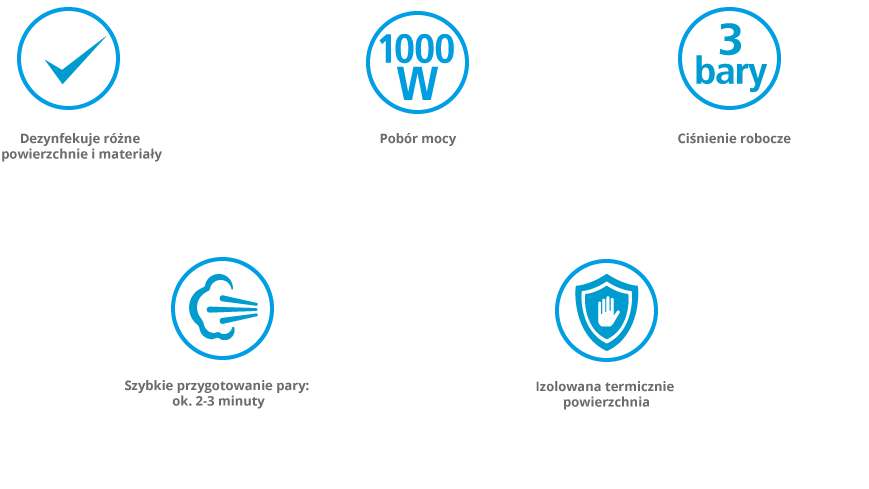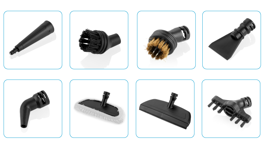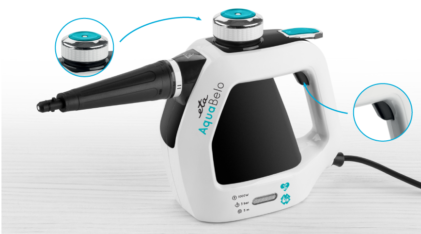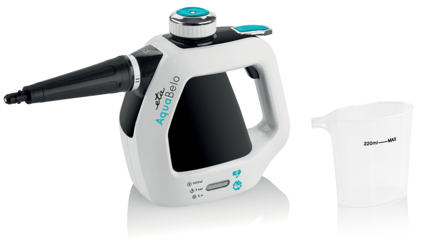Дезінфікує різні поверхні та матеріали. Розчиняє жир та видаляє бруд. Швидке нагрівання приблизно за 2-3 хвилини. ETA Aquabelo дозволяє очистити: умивальники, унітази, душові кабіни, радіатори, решітки, вікна, дзеркала, оббивку, автомобільні кабелі тощо. Автоматичне регулювання Ємність бака: 220 мл Час роботи: близько 10 хвилин ETA Aquabelo має кнопку. запобігання випадкового спрацьовування пари та запобіжний клапан Широкий асортимент аксесуарів: конічна насадка, широка шайба для вікон та гладких поверхонь та тканинний чохол