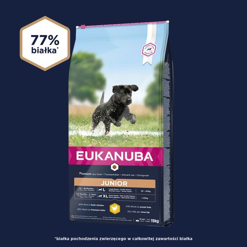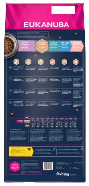 Сухий корм EUKANUBA багатий свіжою куркою і ідеально підходить для собак великих порід у віці від 12 до 18 місяців (від 14 місяців до 2 років для гігантських порід). Ретельно підібрані інгредієнти забезпечують харчування, адаптоване до потреб собаки з точки зору росту та розвитку. Корм EUKANUBA Junior Large Breed містить кислоти DHA для підтримки розумової гостроти та здатності до навчання цуценят. Спеціальна суміш пребіотиків FOS і MOS і бурякового жому підтримує здорове травлення. Корм також містить вітаміни Е і С, які є джерелом антиоксидантів, які зміцнюють імунну систему, і кальцію, який підтримує розвиток кісток. Корм також містить природні джерела кислот Омега-6 та Омега-3 для здорової шкіри та блискучого хутра. Особлива шестикутна форма гранул і унікальна система DentaDefense допомагають зберегти зуби здоровими і чистими. Харчування 100% повноцінне та збалансоване. Удосконалений ефект харчування для собак великих порід, що ростуть, забезпечує оптимальний стан і благополуччя протягом усього їхнього життя.
