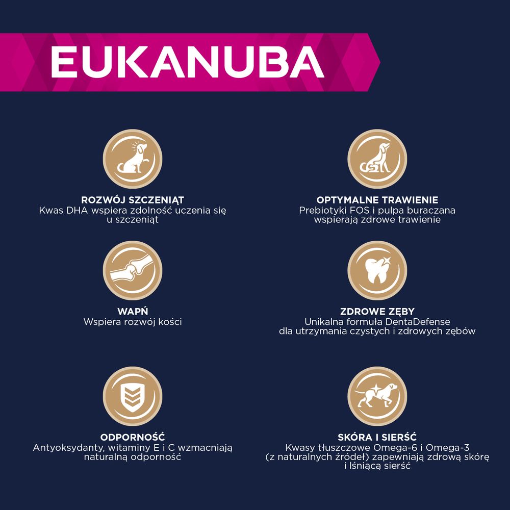 EUKANUBA знає, що собаки походять від хижаків, тому всі рецепти адаптовані до життєвого циклу та розміру собаки. Наші продукти містять високоякісний тваринний білок. Вони підтримують нормальну вагу, здорове травлення, здоров’я шкіри та шерсті, зберігаючи належний рівень енергії. Завдяки їм собака може насолоджуватися оптимальною формою.