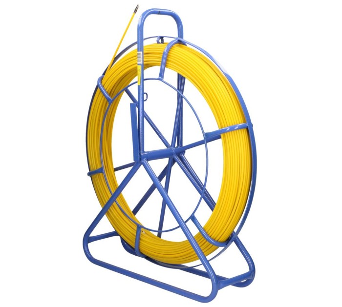 Інструмент для протягування кабелю зі скловолокна FRP, покритого жовтим поліетиленовим пластиком, який є міцним і гнучким. Волокно розміщене на підставці, що полегшує його розгортання. Рамка блакитного кольору з порошковим покриттям, оснащена ручним гальмом-блокатором барабана і спеціальним «вушком» для направлення волокна. Конструкція підставки забезпечує зручне транспортування, зберігання та експлуатацію. На кінці волокна є напрямна головка.