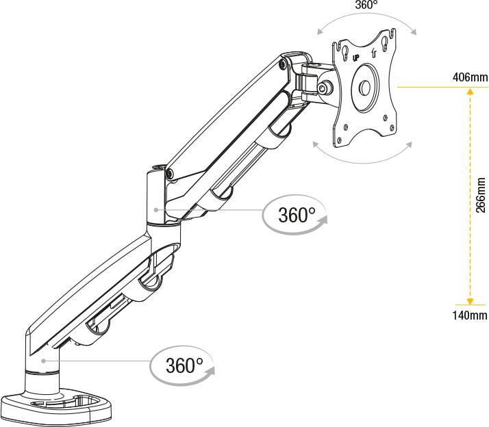 Рука має вбудовану газову пружину, що забезпечує широкі можливості регулювання як по висоті (в діапазоні 26,6 см), так і по висоті (до 53,8 см)._x000D_ см). Це означає, що лише кількома простими рухами ви зможете встановити ідеальне положення монітора:
