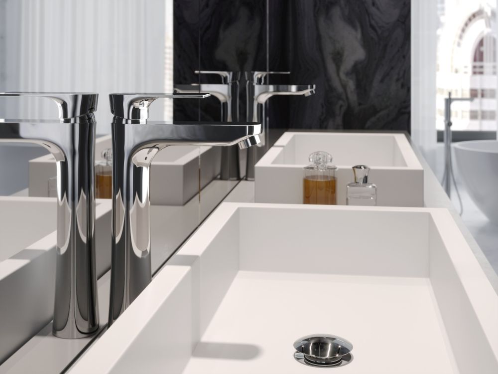 У колекції змішувачів ALGEO SQUARE форма, навіяна прямокутним мотивом, м’яко змінюється на м’яку, обтічну лінію, створюючи цікавий візуальний ефект. Колекція також характеризується ідеально рівними поверхнями ручок і злегка звуженим корпусом у стоячих моделях: умивальника та біде.