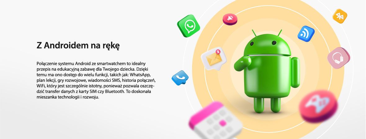 Система Android також надає доступ до багатьох навчальних програм і функцій, таких як: WhatsApp і SMS-повідомлення, завдяки яким діти можуть спілкуватися з родиною та друзями, план уроку, який полегшує організацію навчання, розвиваючі ігри, які підтримують розвиток дитини інтелектуальна розробка, Face Unlock і історія дзвінків для підвищення безпеки використання, WiFi, що особливо важливо, оскільки дозволяє зберегти передачу даних із SIM-карти, або Bluetooth, завдяки якому можна підключатися до інших пристроїв, напр.