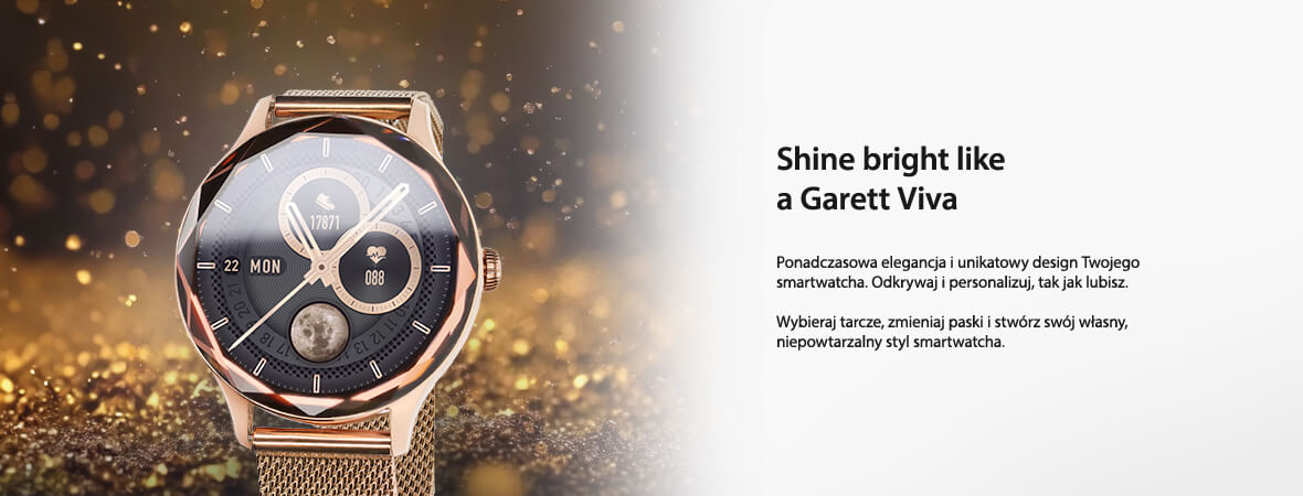 Стильний і унікальний Garett Viva — це більше, ніж просто розумний годинник — це вираження особистості користувача._x000D_ Браслет і ремінець, що входять до комплекту, дозволять адаптувати зовнішній вигляд пристрою до будь-якого випадку, піклуючись про_x000D_ про ваш комфорт і стиль. Силіконовий ремінець був розроблений ще тоншим з думкою про жінок_x000D_ зап'ястя. Екран AMOLED забезпечить яскраві кольори та чітке зображення. Персоналізуйте свій циферблат_x000D_ а різноманітні стилі меню пропонують широкий вибір варіантів, з яких можна вибрати навіть найвибагливіший смак_x000D_ вимогливих користувачів, гарантуючи, що годинник стане унікальним доповненням до будь-якого одягу.
