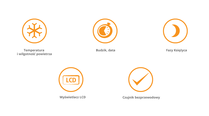 ФункціїZegar, Budzik, Pomiar ciśnienia, Pomiar temperatury wewnętrznej, Pomiar temperatury zewnętrznej, Pomiar wilgotności, Prognoza pogody, Radiowa synchronizacja czasu