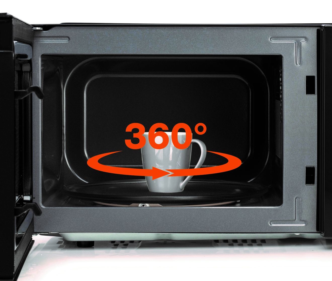 Без холодних зон їжа ідеально готується або розігрівається. Постійне обертання обертової пластини дозволяє мікрохвилям ефективно та рівномірно нагрівати готову їжу. Поворотний столик також є запорукою оптимального розморожування.