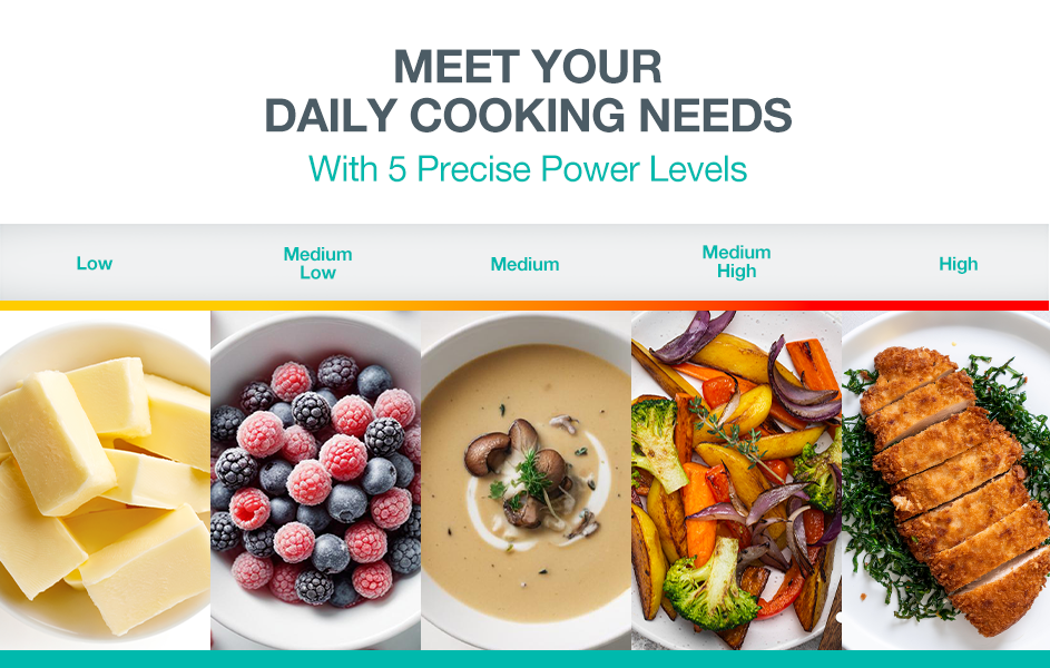 Встановлення рівня потужності на 100%, 70%, 50%, 30% або 10% дає змогу налаштувати приготування їжі відповідно до ваших потреб. Висока потужність чудова, якщо ви хочете швидко нагріти щось, наприклад, коли ви кип’ятите воду або готуєте супи. Середній рівень дозволяє готувати продукти на пару або смажити, тоді як низький рівень підходить для приготування вершкових супів і може діяти як дегідратор.