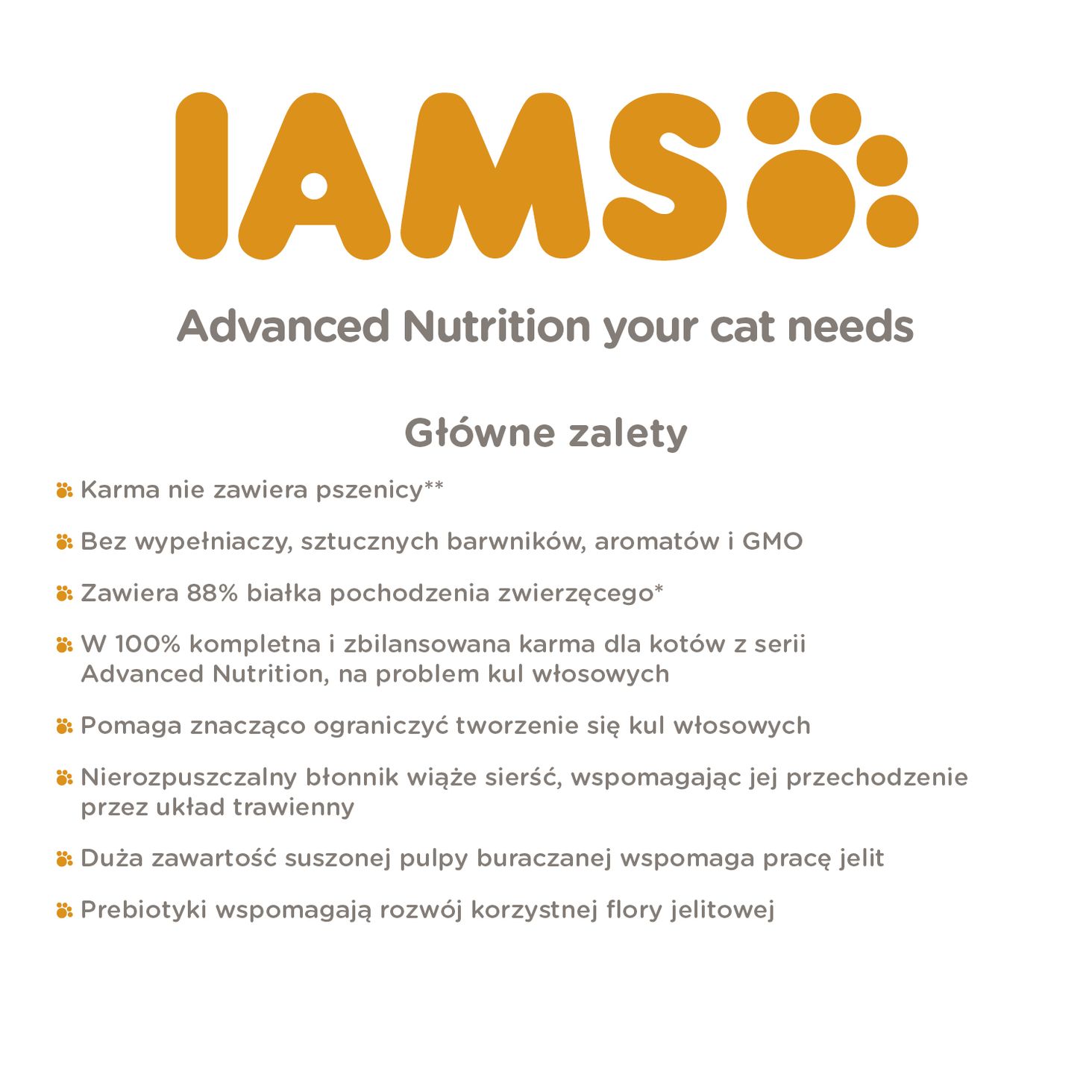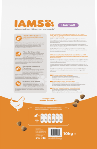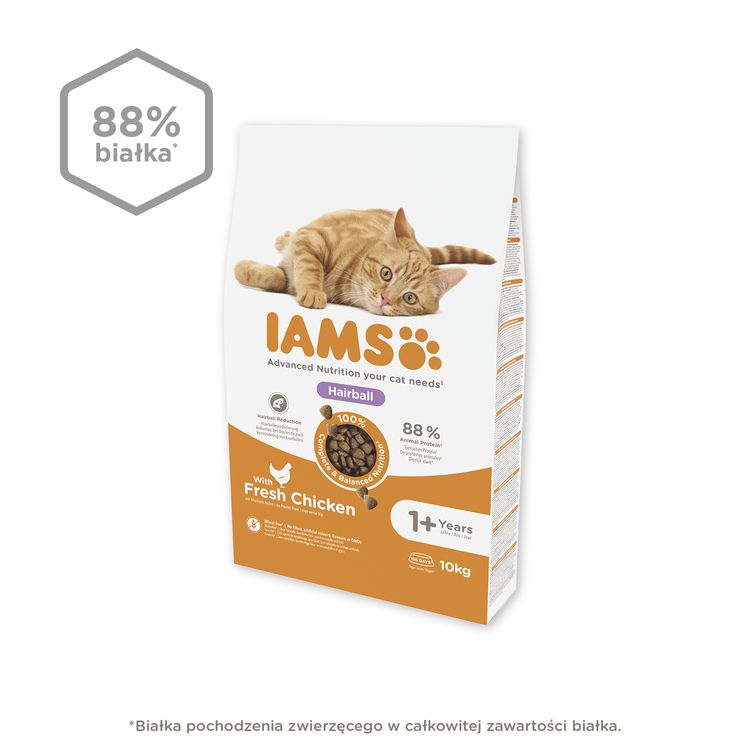 Удосконалене харчування, яке відповідає природним потребам котів і допомагає значно полегшити проблеми з шерстю. Завдяки вмісту тваринного білка 88%* сухий корм IAMS Advanced Nutrition Hairball зі свіжою куркою для котів старше 1 року з проблемами шерстяних кульок дуже смачний. Клітковина, що міститься в їжі, зв’язує хутро, допомагаючи йому проходити через травну систему. Високий вміст сушеного бурякового жому підтримує роботу кишечника. Крім того, пребіотики підтримують розвиток корисної кишкової флори. Обирайте наші котячі корми, створені з комплексним підходом до здоров’я травної системи та ефективного зменшення шерсті.