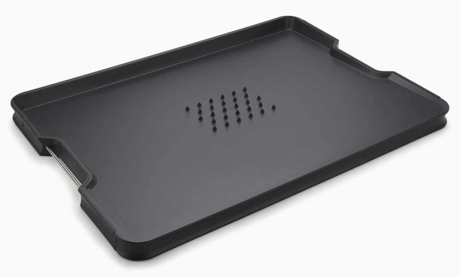 Багатофункціональна обробна дошка з лінії Cut&Carve Plus чорного кольору та розміру XL. Виступи з одного боку для зручності різання м'яса. Ручки для перенесення.