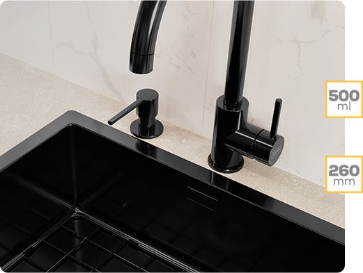 Мийка з дозатором рідини створює повністю обладнану зону миття. Зручний насос подає оптимальну кількість рідини одним натисканням, не боячись, що ємність вислизне з-під мокрих рук під час миття. Диспенсер ідеально підходить для кухонь людей, які приділяють особливу увагу деталям - вмонтований в раковину або стільницю він виглядає естетично і економить місце на кухонній стільниці, зменшуючи кількість пляшечок з миючими засобами, що стоять на ній. Комфорт повсякденного використання забезпечує резервуар з верхнім заповненням об’ємом до 500 мл.