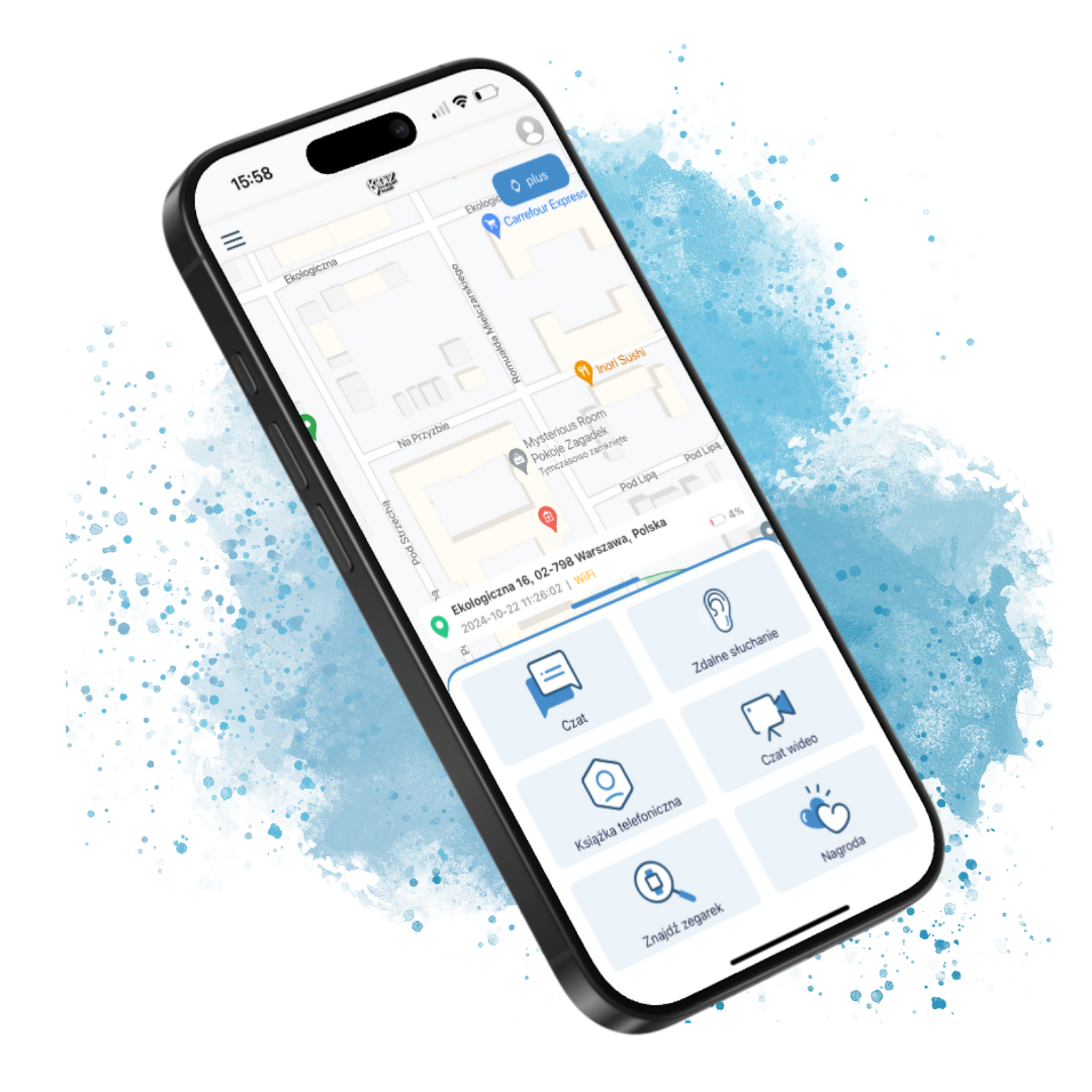 Додаткові функціїPowiadomienia z telefonu, Lokalizacja, Nasłuch otoczenia, Przycisk SOS, Budzik, Latarka, Krokomierz
