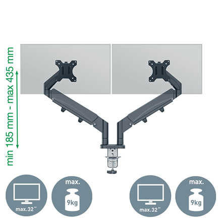 Ергономічне кріплення подвійного монітора дозволяє розташувати монітори на відповідній висоті, допомагаючи підтримувати правильну поставу, не зводячи очей з екрана та зручно розташовувати на шиї та плечах. Компактна конструкція дозволяє встановлювати в місцях з обмеженим простором, забезпечуючи максимальну глибину простору та оптимальної візуальної ергономіки Розташування моніторів можна регулювати абсолютно незалежно один від одного, а коротший опорний кронштейн дозволяє без проблем розміщувати екрани різних розмірів Дві кронштейни з вбудованою пружиною газові камери дозволяють легко регулювати висоту моніторів (185 мм-435 мм) Вони дозволяють повертати монітори на 180°, нахиляти в діапазоні +90°/- 90° і регулювати вгору, вниз, вперед і назад Міцна та стабільна конструкція дозволяє встановити два плоских або два вигнутих монітори з діагоналлю екрана від 17"-32" і вагою до 9 кг (19,8 фунтів) кожен Легко та швидко складання та розбирання за допомогою пластини Vesa® (75 і 100 мм) і C-образного затискача з силіконовим гумовим покриттям, який зменшує вібрацію та захищає поверхню столу, або через наскрізний отвір (діапазон товщини столу: 10-80 мм). Продається в комплекті з інструментами для монтажу та налаштування кабелів, які забезпечують порядок на робочому місці.