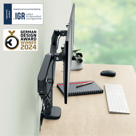 Компактний кронштейн для подвійного монітора Leitz Ergo дає змогу встановлювати екрани на ергономічній висоті, допомагаючи зберігати правильну поставу, зручно розташовувати шию та плечі та не зводити очей з екрана. Кронштейн монітора залишається стабільним на будь-якій висоті і під будь-яким кутом, а також дозволяє повертати екран з горизонтального положення на вертикальне. Конструкція тримача ідеально підходить для місць, де простір на столі обмежений - піднімаючи монітор над стільницею, ми звільняємо цінний простір на столі. Ергономічна ручка підвищує продуктивність і покращує самопочуття.