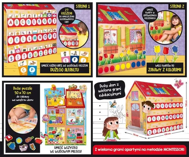 Ігри з ігровим будиночком Монтессорі включають низку освітніх заходів. Діти вивчають алфавіт, нові слова та віршики, розвивають навички логічного мислення завдяки пазлам та тренуються називати кольори. Навчальна графіка та кишеньки з літерами алфавіту заохочують навчитися читати, а чарівні вікна та декорації надихають вас створювати власні історії.