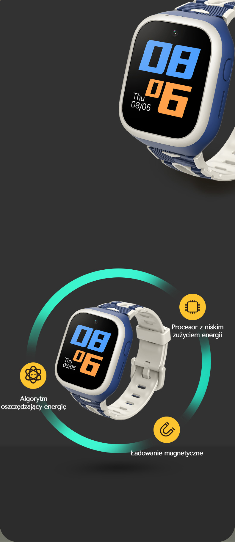 Акумулятор ємністю 900 мАг і спеціальний алгоритм, що сприяє зниженню енергоспоживання, забезпечують роботу годинника дуже довго, безперебійно захищаючи вашу дитину