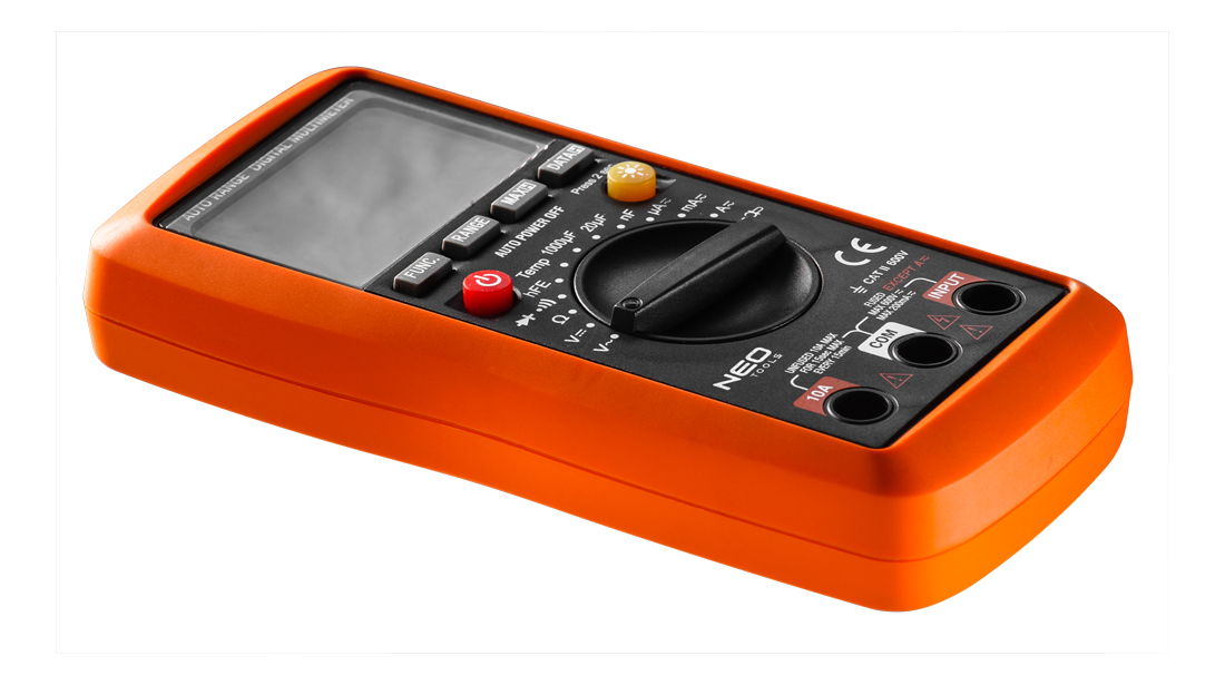 Універсальний електронний вимірювач використовується для вимірювання напруги постійного та змінного струму, значень змінного та постійного струму, електричного опору, перевірки цілісності дроту, hFE (тестер транзисторів), ємності, вимірювання діодів і температури. Має автоматичні діапазони вимірювань і пам'ять останніх вимірювань. Корпус виготовлений з високоякісного пластику. РК-дисплей з підсвічуванням дозволяє працювати в умовах недостатнього освітлення. Додаткові затискачі полегшують вимірювання. Нейлоновий футляр полегшує зберігання та транспортування. Відповідність європейським стандартам безпеки забезпечується сертифікатом CE. Торгова марка Neo виправдовує очікування професіоналів