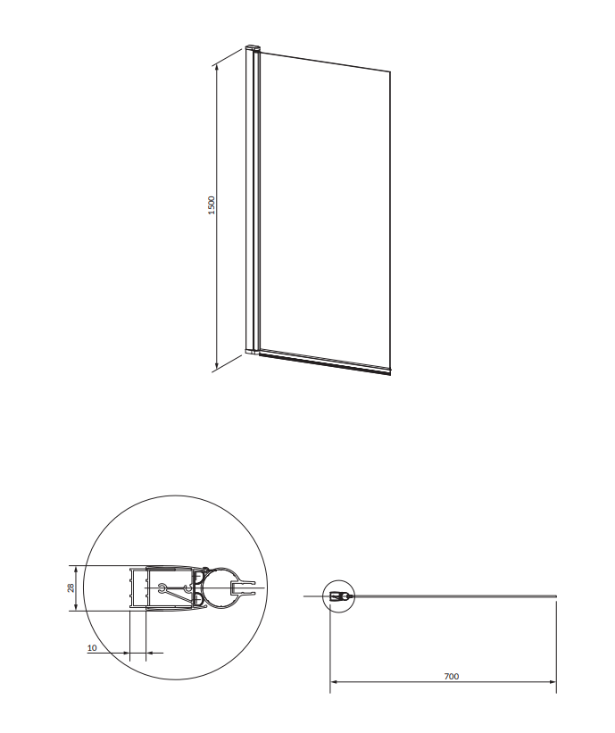 ширина: 70 см, висота: 150 см, відкривається на двох бокових безпечних скліннях, товщина: 5 мм, петлі з підйомним механізмом, алюмінієвий профіль