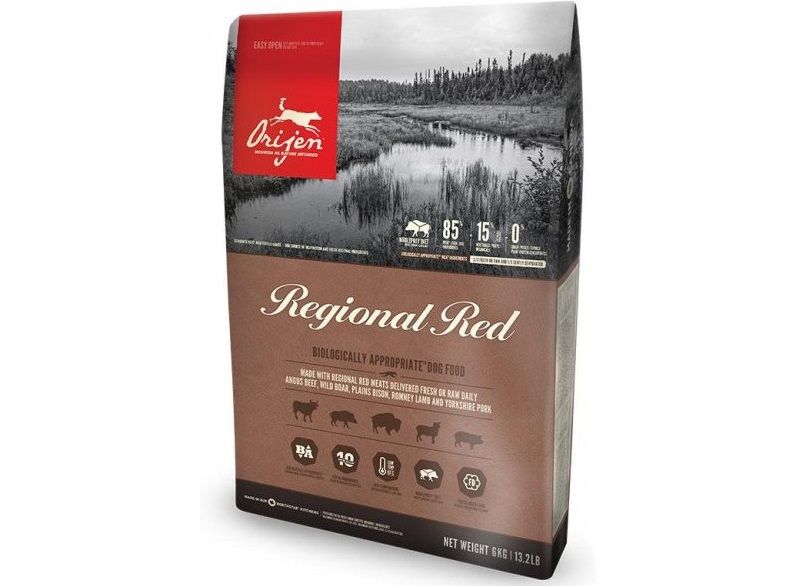 Склад Orijen Dog Regional Red заснований на значній кількості різноманітних м'ясних інгредієнтів, серед яких: свіжа яловичина ангус, кабан, бізон, баранина Ромні та свинина йоркшир. Загалом корм містить 85% червоного м’яса, риби та яєць, що забезпечує надійну основу для здорового харчування вашої собаки. Решта 15% - це овочі, фрукти та трави, які забезпечують необхідні вітаміни та мінерали, при повній відсутності зерна, картоплі, тапіоки або рослинних білкових концентратів. Додавання ліофілізованої печінки покращує смак корму, що особливо важливо для вибагливих собак.