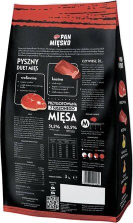 Pan Mięsko Яловичина та козячий корм для собак хрусткий M Повнораціонний корм для дорослих собак. Виготовляється з в'яленого м'яса, виробництва Польща._x000D_ Гіпоалергенні сухі корми для собак Pan Mięsko відрізняються ретельним відбором м'яса. Додавання соковитих польських яблук, корисних овочів і цінних поживних речовин позитивно впливає на здоров'я і стан вашої собаки. Рецепти підготовлені фахівцями, щоб забезпечити вашого чотириногого супутника саме тим, що йому потрібно. Яловичина багата на залізо, а також є чудовим джерелом легкозасвоюваного білка та вітаміну А. Козятина — нежирне м’ясо та джерело ненасичених жирних кислот Омега-3, а також кальцію та фосфору._x000D_ Ефективний розум – завдяки кислотам Омега-3_x000D_ Хороше травлення – забезпечується пребіотиками FOS і MOS_x000D_ Здорові суглоби – підтримуються корисними добавками, такими як глюкозамін і хондроїтин_x000D_ Імунітет – зміцнюється завдяки таурину і сухим пивним дріжджам_x000D_ Красиве і блискуче хутро - забезпечується додаванням олії лосося_x000D_ Менше зубного каменю - ось результат оптимально збалансованого харчування