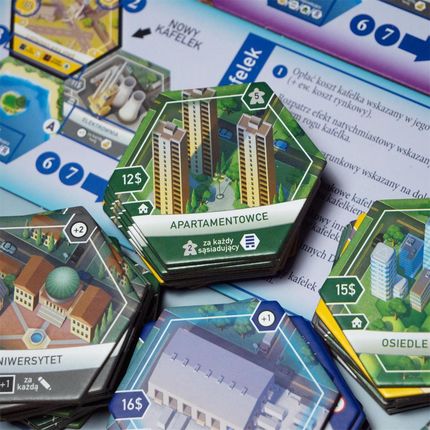 РозвитокПід час кожного ходу ви маєте виконати 4 дії, перша з яких – розмістити 1 плитку будівлі або 1 маркер інвестицій. Ви можете вибрати плитку Ринок нерухомості та базову плитку (Фабрики, Передмістя, Міські парки). Беручи плитку з Ринку нерухомості, ви оплачуєте її вартість, а потім розміщуєте принаймні 1 плитку свого району поруч із нею, усуваючи її ефекти, а також ефекти попередньо розміщених плиток. Таким чином, кожна наступна дія буде прискорювати ваш розвиток.