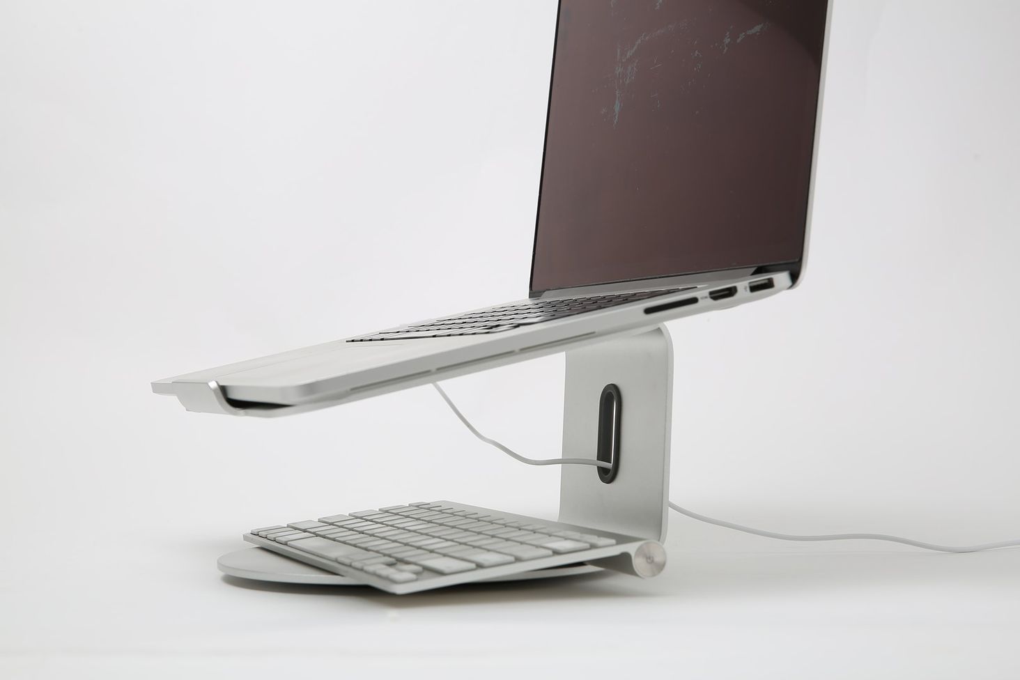Нековзкі гумові ніжки міцно тримають пристрій на місці, захищаючи його від подряпин. Алюмінієва передня панель надійно тримає ваш пристрій і запобігає його ковзанню, коли ви друкуєте, підключаєте кабелі або виймаєте носії з портів USB. База сумісна з мобільними пристроями з діагоналлю екрана від 10" до 17".