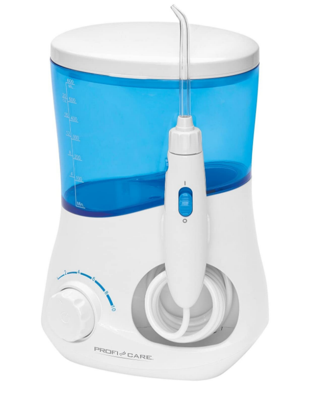 Іригатор PROFICARE PC-MD 3005 незамінний у підтримці оптимальної гігієни порожнини рота, чищенні та масажі ясен та очищенні міжзубних проміжків. Має великий знімний резервуар для води об’ємом 600 мл із захистом від падіння, 2-хвилинний таймер, кришку з вбудованим відсіком для зберігання наконечників, кнопку на ручці для перекриття потоку води, відсік для зберігання шланга, три одинарних наконечники поршнів і один наконечник для очищення язика з різнокольоровими позначками.