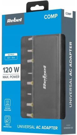Універсальний блок живлення REBEL з 11 клемами і потужністю 120 Вт. Підходить для більшості найпопулярніших моделей ноутбуків. Універсальний блок живлення характеризується найкращою якістю і виготовлений з високоякісних матеріалів. Ідеально підходить для дому та роботи, як основне або резервне джерело живлення. Адаптер змінного струму на 120 Вт має 11 моделей наконечників, завдяки яким його можна адаптувати до кількох моделей ноутбуків.