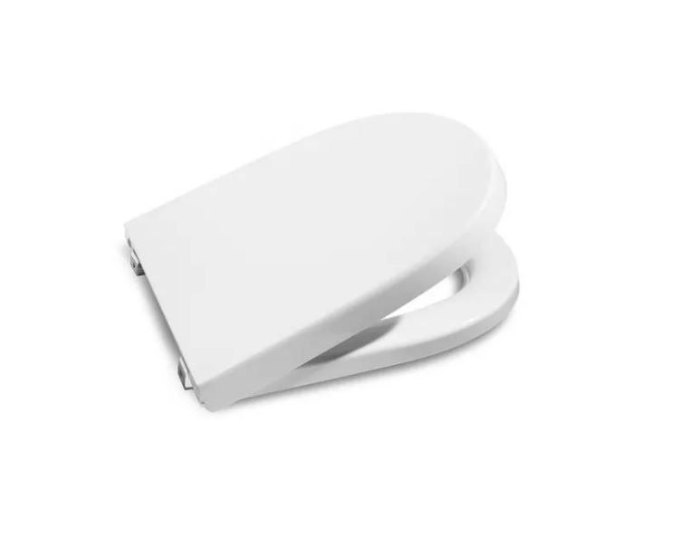 Сидіння для унітазу білого кольору від бренду Roca. Дошка з системою повільного і безшумного спуску. Його матеріал – дюропласт, а матеріал петель – нержавіюча сталь