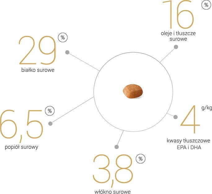 сушений білок птиці, рис, кукурудза, білковий ізолят _x000D_ рослинні*, тваринні жири, пшениця, рослинна клітковина, гідролізат _x000D_ тваринний білок, буряковий жом, мінеральні солі, риб'ячий жир, олія _x000D_ соєві боби, фруктоолігосахариди, лушпиння та насіння подорожника, дріжджовий екстракт_x000D_ (джерело манан-олігосахаридів), гідролізат ракоподібних (джерело _x000D_ глюкозамін), олія огірочника (0,1%), екстракт календули _x000D_ (джерело лютеїну), гідролізат хряща (джерело хондроїтину).