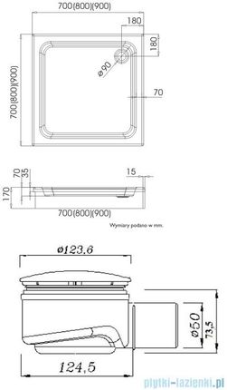 Кат. № 3.0121 Довжина 70 см Ширина 70 см Радіус - Висота 17 см Глибина 7 см Форма: квадратМатеріал: санітарний акрилКолір: білий Спосіб монтажу: на підлогуДіаметр зливу: 90ммГарантія: 10 років