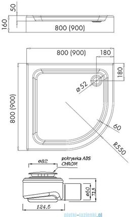 розміри: 90x90x16 см, довжина: 90 см, ширина: 90 см, висота: 16 см, глибина: 5 см, матеріал: акрил, посилений смолою, тип: напівкруглий, діаметр зливу: Ø 52 мм, колір: білий , спосіб монтажу: на підлогу, радіус: R55, опора піддону в комплекті, без сифона, ГАРАНТІЯ 5 років.