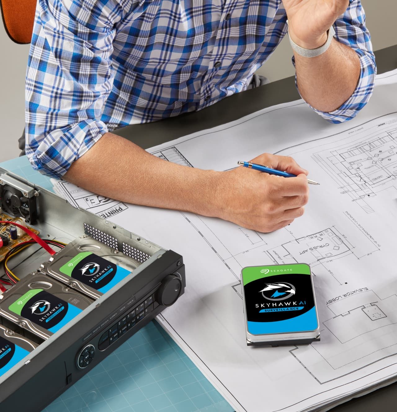 Розроблений для систем відеоспостереження зі штучним інтелектом, диск SkyHawk зі штучним інтелектом підтримує до 64 HD-камер і 32 додаткові потоки штучного інтелекту, водночас пропонуючи ємність до 18 ТБ. Він гарантує нульову втрату кадрів завдяки програмному забезпеченню ImagePerfect AI і може похвалитися робочим навантаженням корпоративного класу 550 ТБ/рік для високої надійності.