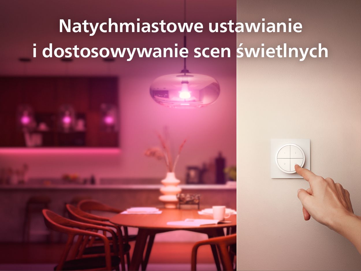 Функція затемнення та посилення світла перемикача Hue Tap — це розумно! Обережно та повільно повертаючи вимикач, ви поступово посилите або приглушите світло. Повертаючи швидше, ви миттєво посилите або приглушите світло в кімнаті.