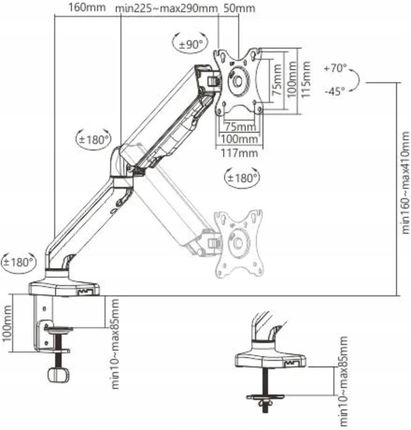 2 можливі варіанти кріплення: через отвір і затискач. Можливість встановлення на більшість стільниць, столів тощо. Знімне кріплення VESA для легкої установки на монітор. Затискачі для кабелів забезпечують організоване та безладне робоче місце. ШИРОКИЙ СПІЛЬ РЕГУЛЮВАНЬ ДЛЯ КОЖНОГО КОРИСТУВАЧА. Кріплення для монітора ідеально підходять для домашнього офісу або ігрової системи, оскільки вони дозволяють розташувати його на потрібному рівні та в потрібному напрямку дозволяє легко регулювати для кращого перегляду та зменшення відбиття світла. Можливість повороту вліво-вправо на 180 градусів вгору і вниз на 45 градусів; і горизонтально і горизонтально 90 град. ОСНОВНІ ХАРАКТЕРИСТИКИ ТРИМАЧА МОНІТОРА