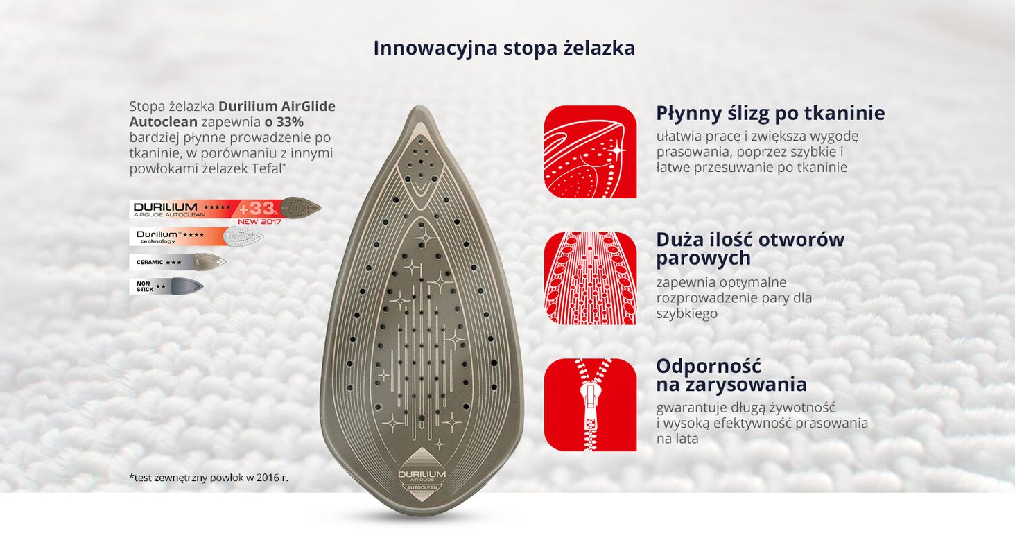 Покриття Durilium AirGlide і велика кількість парових отворів покращують розподіл пари, роблячи прасування легким і ефективним. Завдяки функції AutoClean підошва праски залишатиметься чистою протягом тривалого часу.