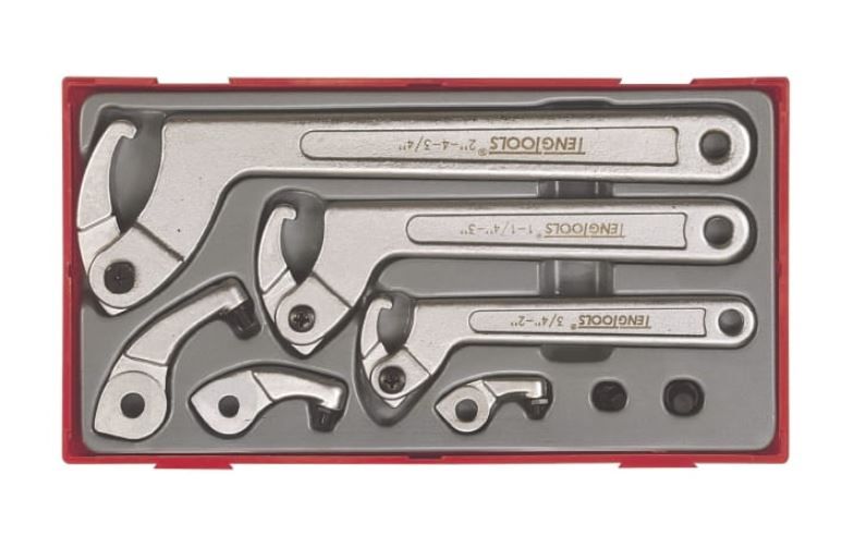 Характеристики виробу: Складається з 3 універсальних ключів типу гачок, з 3 штифтовими перехідниками і 2 одинарними штифтами діаметром 6 і 8 мм. Поставляється в пластиковому контейнері зі знімною кришкою. Підходить для ящиків для інструментів Teng Tools і візків. Ключі для діаметрів: 19-50 30-75 50-120 мм Для діаметрів хвостовика: 4 5 6 мм. діаметри: 6 8 мм Розміри контейнера ДхШхВ: 265х142х50 мм Вага: 1,2 кг