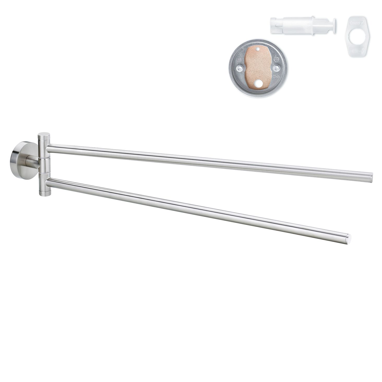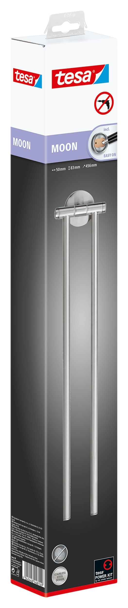 Простий рушникодержатель з двома рухомими кронштейнами - елегантне і практичне місце для рушників у ванній кімнаті. Легко монтується БЕЗ СВЕРДЛЕННЯ завдяки технології tesa® Power.Kit Постійне кріплення, яке знімається, не залишаючи слідів. Можна повторно зібрати за допомогою нового адаптера. Код продукту: 40303 Розміри: 83 мм x 50 мм x 456 мм. Покриття: матове. Форма основи: кругла. Серія: Moon.