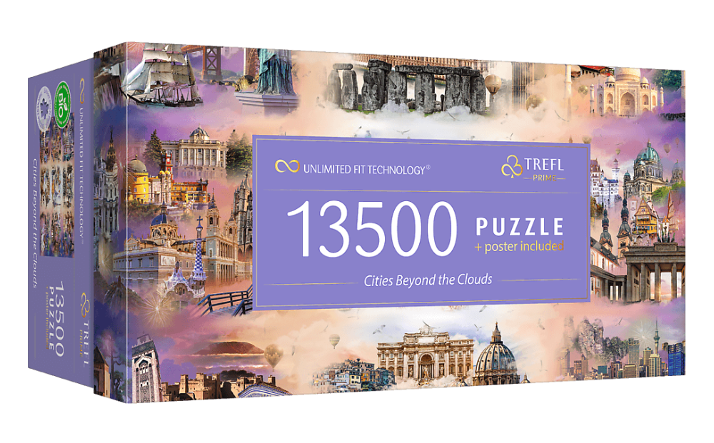 Відкрийте для себе головоломку Trefl Prime UFT - Захмарні міста, яка складається з вражаючих 13 500 частин! На них зображено оповитий хмарами колаж із відомими містами з усього світу – від Нью-Йорка до Сіднея.