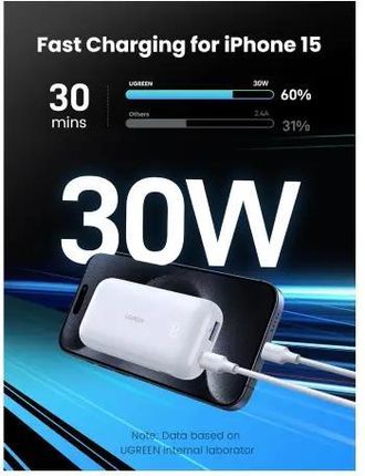 Виробник UgreenМодель PB501 Ємність 10000 мАг Швидка зарядка PD 30 Вт і SCP 22,5 Вт Порти USB-C і USB-AC Колір Білий